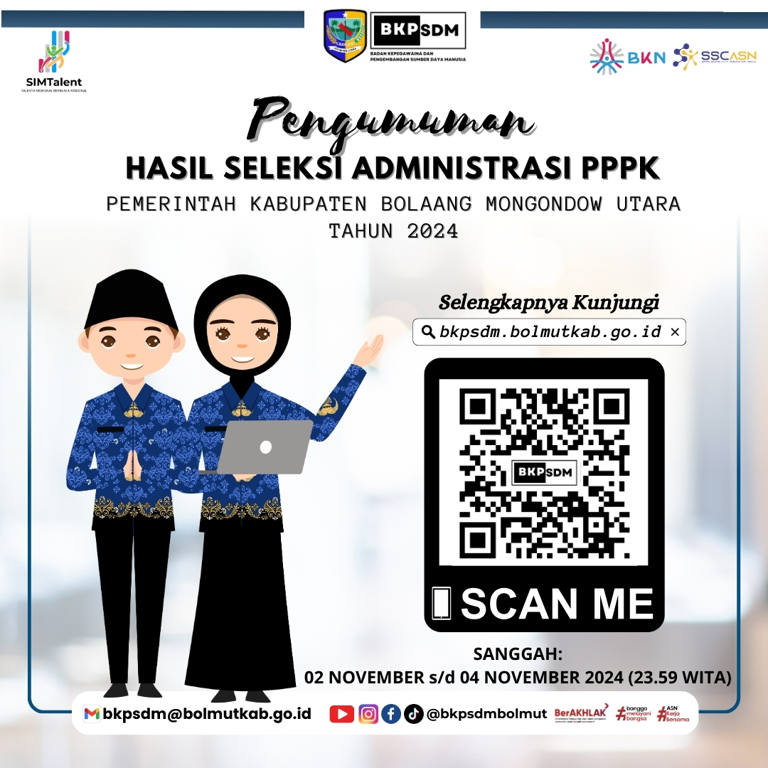 1. Pelamar dapat melihat hasil Seleksi Administrasi pada akun masing-masing melalui laman: https://sscasn.bkn.go.id, dan akan diumumkan melalui website resmi BKPSDM Kabupaten Bolaang Mongondow Utara pada laman: https://www.bkpsdm.bolmutkab.go.id;