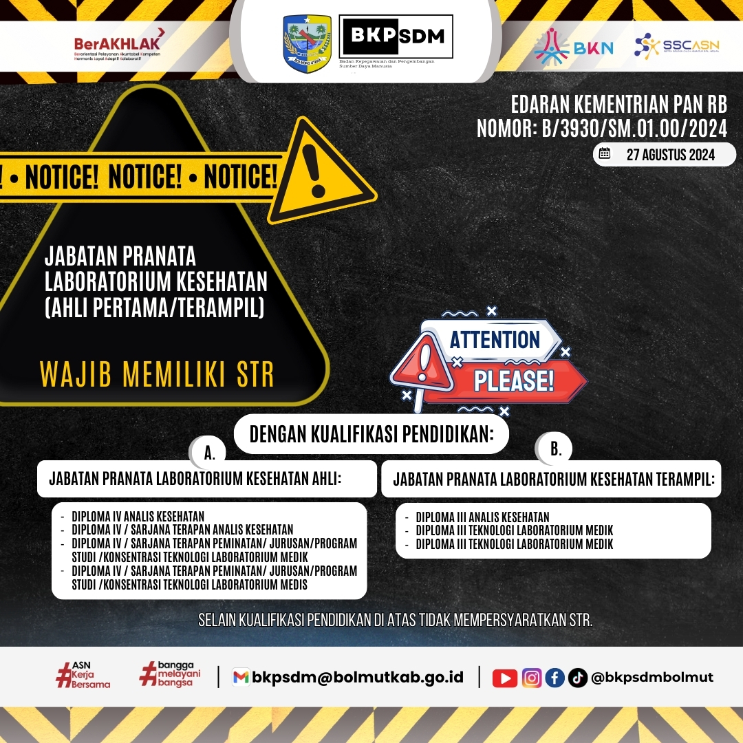 I. Berdasarkan Keputusan Menteri PANRB Nomor 322 Tahun 2024 tentang Persyaratan Surat Tanda Registrasi untuk Melamar pada Jabatan Fungsional Kesehatan dalam Pengadaan Aparatur Sipil Negara Tahun Anggaran 2024, bahwa pelamar yang mendaftar pada jabatan pranata laboratorium kesehatan baik keahlian dan keterampilan, apabila mendaftar pada fasilitas kesehatan yang mempunyai tugas dan fungsi pengambilan spesimen biologi/sampel wajib memiliki STR;