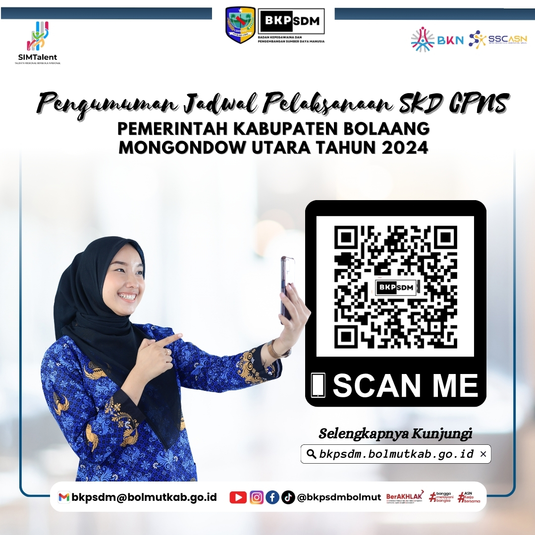 Memperhatikan Surat Badan Kepegawaian Negara Nomor: 6857/B-KS.04.01/SD/E/2024 tanggal 7 Oktober , Perihal Penyampaian Jadwal Seleksi Kompetensi Dasar (SKD) Calon Pegawai Negeri Sipil (CPNS ) Tahun Anggaran 2024, dengan ini kami informasikan hal- hal terkait Seleksi Kompetensi Dasar (SKD) Calon Pegawai Negeri Sipil dilingkungan Pemerintah Kabupaten Bolaang Mongondow Utara, sebagai berikut :