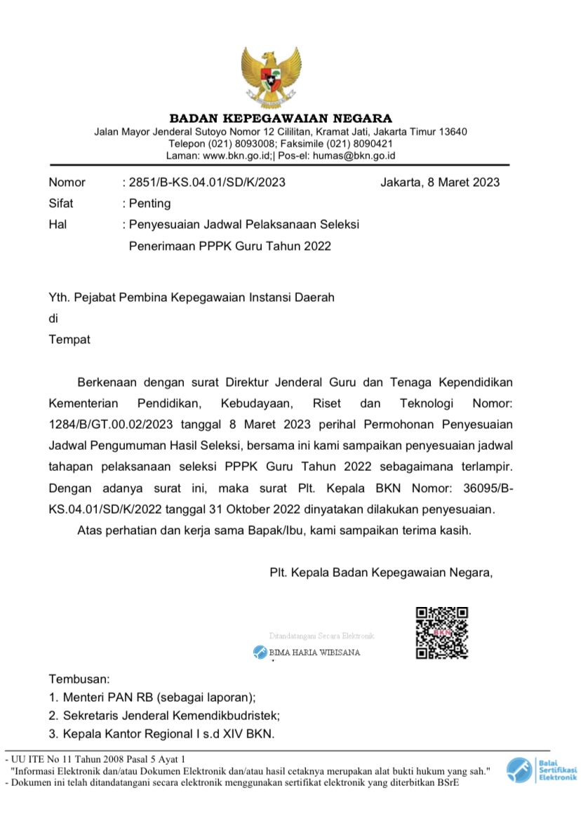 Berkenaan dengan surat Direktur Jenderal Guru dan Tenaga Kependidikan Kementerian Pendidikan, Kebudayaan, Riset dan Teknologi Nomor: 1284/B/GT.00.02/2023 tanggal 8 Maret 2023 perihal Permohonan Penyesuaian Jadwal Pengumuman Hasil Seleksi, bersama ini kami sampaikan penyesuaian jadwal tahapan pelaksanaan seleksi PPPK Guru Tahun 2022 sebagaimana terlampir. Dengan adanya surat ini, maka surat Plt. Kepala BKN Nomor: 36095/B- KS.04.01/SD/K/2022 tanggal 31 Oktober 2022 dinyatakan dilakukan penyesuaian.
