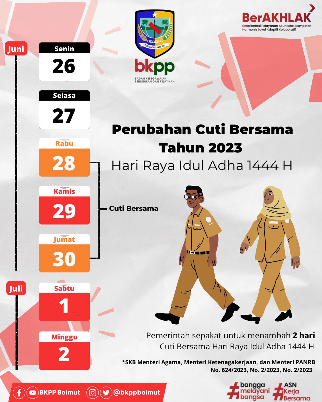 Keputusan Bupati Bolaang Mongondow Utara Nomor: 800/869/SetdaKab.BKPP tentang Perubahan Kedua Atas Keputusan Bupati Bolaang Mongondow Utara tentang Hari Libur Nasional dan Cuti Bersama di Lingkungan Pemerintah Kabupaten Bolaang Mongondow Utara Tahun 2023