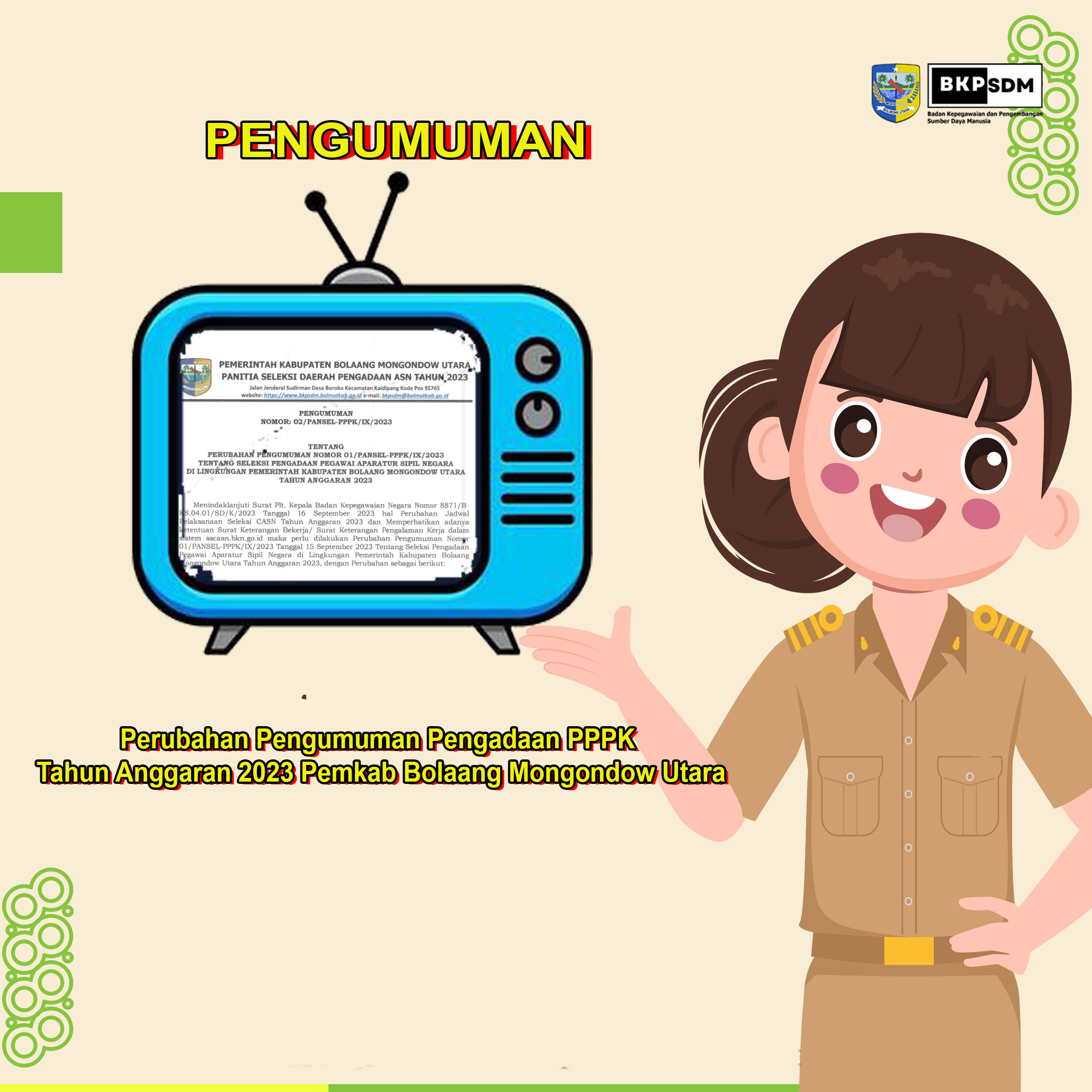 Menindaklanjuti Surat Plt. Kepala Badan Kepegawaian Negara Nomor 8871/B-KS.01.01/SD/K/2023 Tanggal 16 September 2023 tentang Perubahan Jadwal Pelaksanaan Seleksi CASN Tahun Anggaran 2023 dan Memperhatikan adanya ketentuan Surat Keterangan Bekerja/ Surat Keterangan Pengalaman Kerja dalam sistem sscasn.bkn.go.id maka perlu dilakukan Perubahan Pengunguman. (_fs.b)