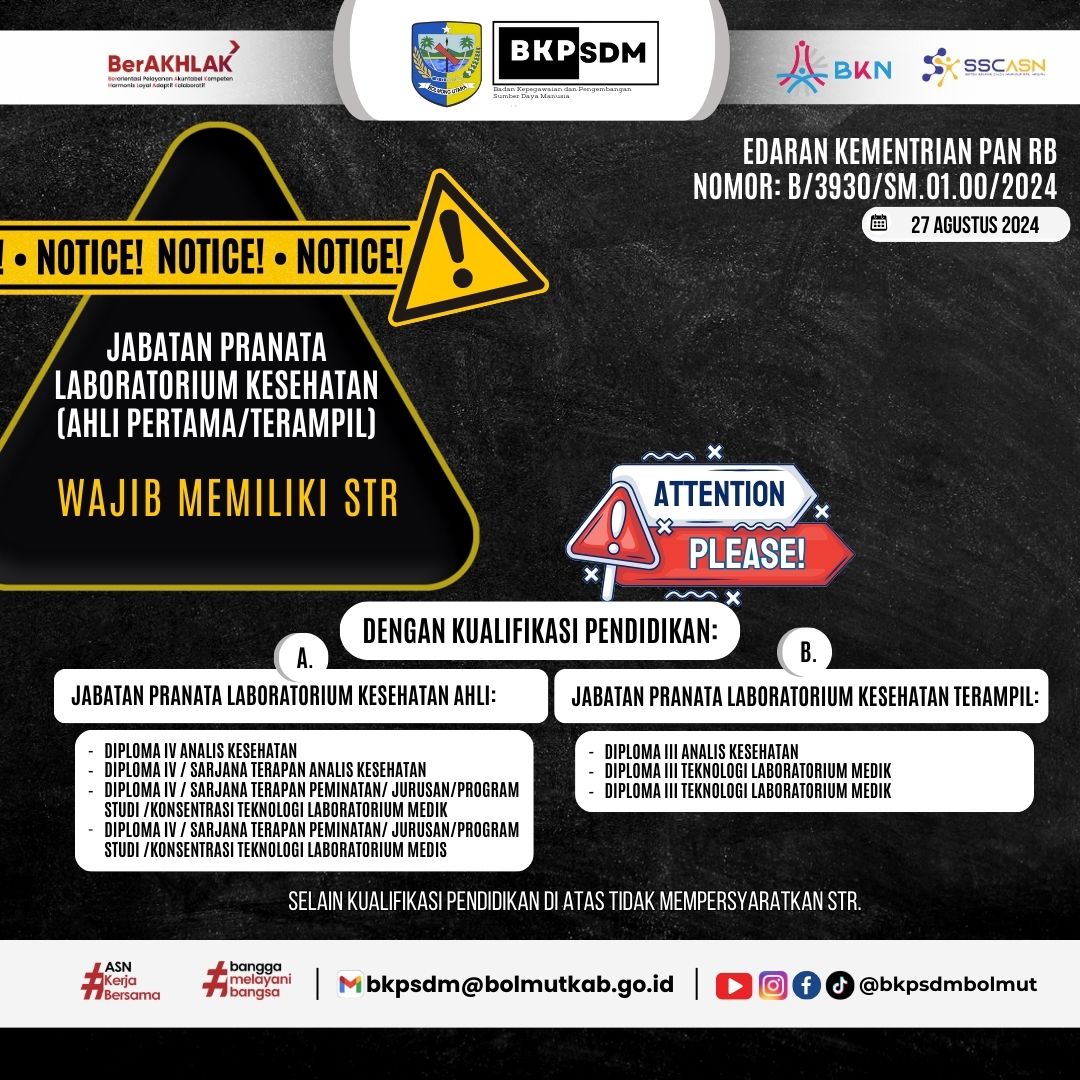Memperhatikan Keputusan Menteri Pendayagunaan Aparatur Negara dan Reformasi Birokrasi Republik Indonesia Nomor 322 Tahun 2024 Tentang Persyaratan Surat Tanda Registrasi Untuk melamar pada Jabatan Fungsional Kesehatan Dalam Pengadaan Aparatur Sipil Negara Tahun Anggaran 2024 dan Surat Kementrian Pendayagunaan Aparatur Negara dan Reformasi Birokrasi Republik Indonesia Nomor: B.3930/SM.01.00/2024 perihal Tindak Lanjut atas Surat Direktur Jenderal Tenaga Kesehatan Kementrian Kesehatan terkait dengan permohonan Penjelasan Keputusan Menteri PANRB Nomor 322 Tahun 2024, disampaikan hal-hal sebagai berikut :